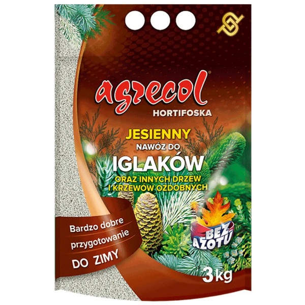 Гранульоване калійно-магнієве добриво Agrecol Hortifoska призначене для осіннього підживлення всіх видів хвойних рослин, з метою їхнього підготування до важких зимових умов. Дане підживлення також підходить для вирощування декоративно-листяних дерев і чагарників, оскільки не змінює рН субстрату. Основні діючі речовини даного добрива: калій (K2O) – 25%, магній (MgO) – 12% та сірка (S) – 19%. Високий вміст калію прискорює одеревеніння пагонів, що оберігає менш стійкі породи дерев та чагарників від вимерзання. Магній входить до складу ферментів, які відповідають за стійкість рослин до перепадів температур. Його вміст у добривах ефективно перешкоджає побурінню голок хвойних рослин. Сірка необхідна для створення хімічних сполук, що підвищують стійкість рослин до грибкових та бактеріальних захворювань. Оптимальне поєднання мікроелементів забезпечує рослинам активний розвиток та достатню енергію росту навесні. Осіннє добриво Hortifoska для хвойних та інших декоративних дерев та чагарників не містить азоту, тому не стимулює рослини до інтенсивного росту та утворенню молодих пагонів, чутливих до низьких температур. Збалансований склад даного засобу сприяє вступу рослин у стан зимового спокою, а також підвищує зимостійкість та морозостійкість хвойних. Добриво Хортіфоска успішно застосовується для підживлення ялини, сосни, кіпарисовику, ялівцю, туї, кедра, самшиту, падубу, бузку, ялиці, жасмину, плюща, тису, мікробіоти, хости, хмелю, ліщини та інших рослин.