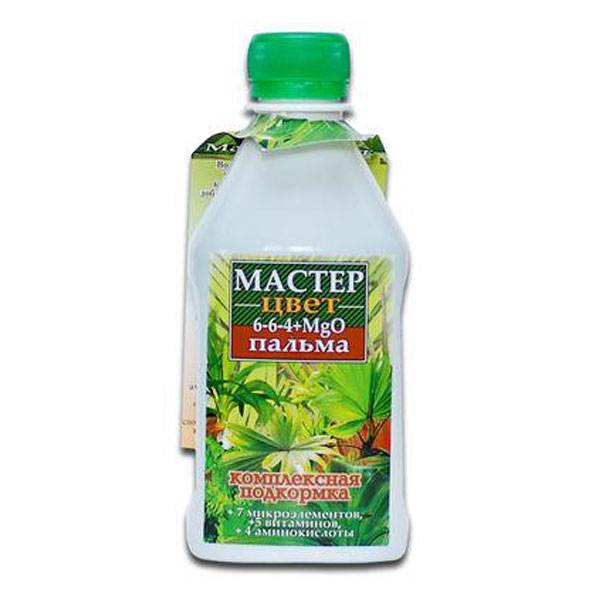 Добриво для пальм Майстер Колір - добавка для комплексного підживлення всіх видів пальм закритого та відкритого ґрунту. До складу засобу не входить хлор, що робить його абсолютно безпечним навіть для використання на саджанцях або куплених рослинах. Особливістю є широкий спектр використання. Добавка застосовується не тільки для пальм, але і для папороті. Вигляд: Мінеральне. Класифікація: Водорозчинне, рідке. Тип: Для пальм. Призначення: Добриво Майстер Колір для пальм збільшує густоту листя, значно підвищує її стійкість до дії агресивних факторів. Завдяки збалансованій формулі, в якій поєднуються новітні технології та необхідні цим рослинам, мінеральні компоненти, добавка зміцнює кореневу систему та прискорює зростання. Рекомендується для застосування навіть за складних порушень росту. Застосування: Концентрат Майстер Колір для пальм та папоротей може використовуватися кореневим та листяним способом. Для поливу один ковпачок добрива потрібно розчинити в 1 літрі мінеральної чи дистильованої води. Вносити з періодичністю 1 раз на 2 тиждень під час фази активного зростання та припинити використання у період спокою. Для обприскування використовується менш концентрована суміш: 1 ковпачок розчиняється у 3 літрах води. Склад: Азот, калій, магній, амінокислоти, вітаміни, мікроелементи. Обсяг: 300 мл. Країна: Україна.