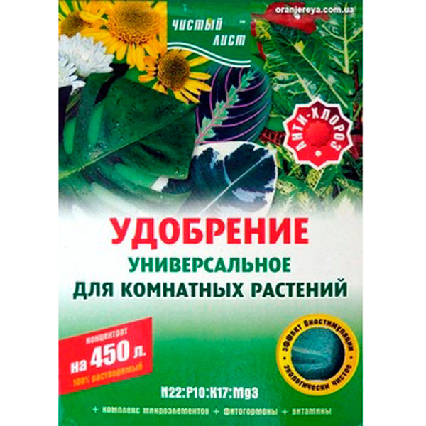 Універсальне добриво для кімнатних рослин Чистий лист - кристалічна добавка з багатим мінеральним складом. Макро- та мікроелементи у цій формулі комбінуються з вітамінами та фітогормонами росту. Це дозволяє використовувати добавку для відновлення родючості ґрунту, насичення рослин корисними речовинами та покращення його зовнішнього вигляду. Вигляд: Мінеральне. Класифікація: Для кімнатних рослин. Тип: Водорозчинні гранули. Призначення: Добриво Чисте Лист N22:P10:K17:Mg3 використовується для зміцнення кореневої системи та якнайшвидшого вкорінення саджанців або рослин після пікірування. Вітаміни та кислоти у складі сприяють тривалому цвітінню та посиленій бутонізації. Крім того, добавка стимулює зав'язь плодів і сприяє їхній красі та транспортабельності. Азот допомагає покращити родючість ґрунту та прискорює переробку кисню. Застосування: Можливе кореневе та позакореневе внесення. При кореневому внесенні половина мірної ложки або змішується з ґрунтом (субстратом), або з'єднується з теплою водою. Як основа для приготування розчину рекомендується використовувати мінеральну або дистильовану рідину. При листовому внесенні половина чайної ложки універсального добрива Чистий лист з'єднується з 10 літрами води. Склад: Мікро- та макроелементи (залізо, мідь, молібден, магній та інші), азот, калій, вітаміни, фітогормони, додаткові компоненти. Вага: 300 грам. Країна: Україна.
