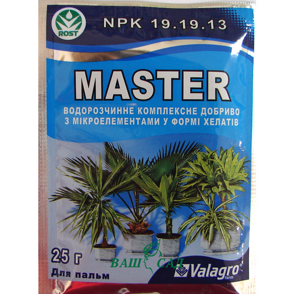 Добриво "Майстер" для пальм 19-19-13 спеціальне, високоефективне, безхлорне, водорозчинне комплексне добриво з мікроелементами у формі хелатів, призначене для кореневого підживлення всіх видів пальм. Збалансоване співвідношення мікро- та макроелементів задовольняє всі потреби рослин у поживних речовинах, сприяє інтенсивності забарвлення листя, збільшує масу надземної частини рослини, підвищує рівень опірності хвороб та гнил. Норми витрати: 5 г препарату розчинити у 2 л води та поливати рослини під корінь. NPK 19-19-13