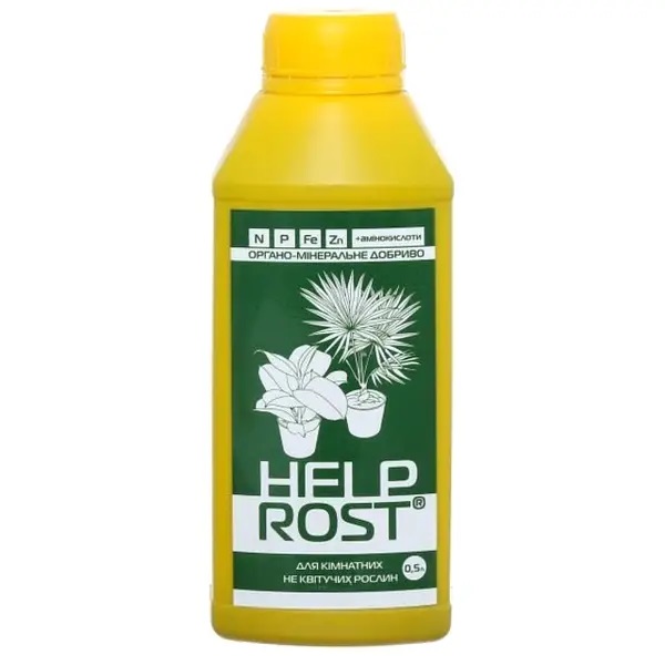 Комплексне органо-мінеральне добриво Help Rost застосовується для кореневого підживлення та обприскування всіх видів декоративно-листяних рослин як садового, так і кімнатного типу. Підживлення містить весь необхідний комплекс елементів живлення, підвищує імунітет рослин, сприяє приросту зеленої маси, а також знижує ризик пожовтіння та опадання листя. Діючою речовиною добрива є цілий комплекс корисних речовин, макро- та мікроелементів (азот, фосфор, калій, залізо, марганець, цинк, мідь, бор, молібден, магній), амінокислот (понад 16 видів), полісахаридів, вітамінів групи В, а також хелатовані продукти метаболізму мікроорганізмів. Добриво Хелп Рост забезпечує інтенсивне та яскраве забарвлення листя, розвиває кореневу систему, збагачує грунт необхідними елементами, підвищує імунітет рослин, стимулює та покращує їх ріст.