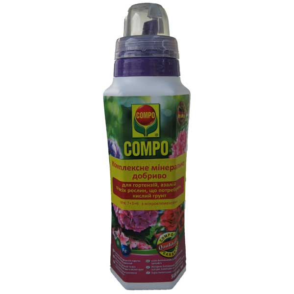 Рідке добриво для гортензій призначене спеціально для різних сортів гортензії, а також кислотолюбних рослин. Гарантує гарне та довге цвітіння. Період застосування: у теплу пору року – 2 рази на тиждень, в холодну пору року - 1 раз на місяць. Об'єм: 0,5 л. Країна-виробник: Німеччина.