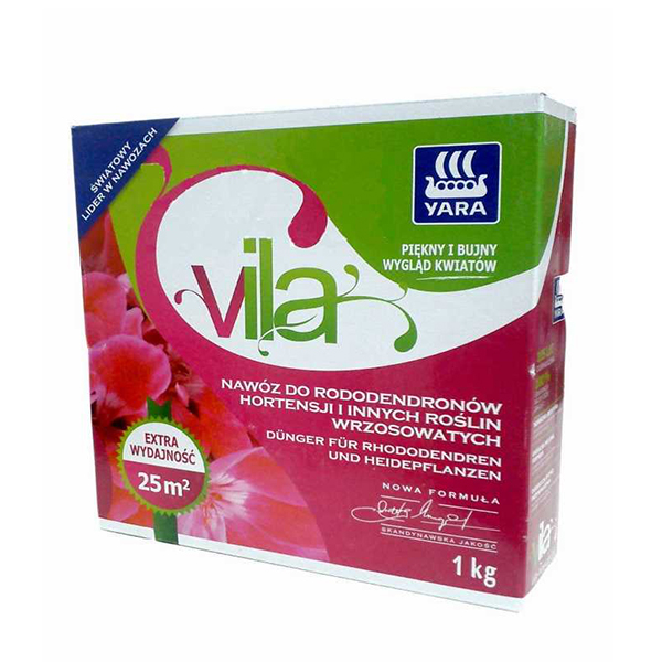 Добрива для рододендронів та азалій, гортензій та вересових Yara Vila - багатокомпонентне гранульоване добриво призначене для догляду за рослинами, що люблять кислі ґрунти - рододендронами, азаліями, гортензіями та вересовими рослинами. Багатий хімічний склад кислих добрив забезпечує рясне цвітіння і надає квітам гарного забарвлення. Регулярне застосування добрив підвищує імунітет та морозостійкість рослин. Багатий склад добрива кислої реакції із вмістом магнію та бору забезпечує активне зростання, сприяє утворенню сильних та здорових нирок. Захист від хлорозу (темні плями на листі). Застосування: Добриво розсипаємо рівномірно навколо рослини, акуратно перемішуємо з верхнім шаром ґрунту та рясно поливаємо. Використовуємо двічі протягом сезону: з інтервалом близько 50 днів, двічі на період вегетації рання весна (березень-квітень) та влітку (липень-серпень) у рівних дозах. Молоді насадження підгодовуємо провесною (березень). Дозування: Молоді насадження: близько 10гр під кожну рослину 30-40 г/м2. Старі насадження: 40-50 г/м2(4-5 кг/100м2), або кожні 10см висоти гортензії або рододендрону по 5гр добрива рівномірно навколо приствольного кола. Розфасовка: 1 та 3 кг