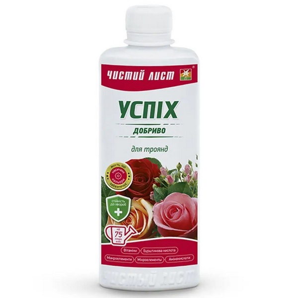 Чистий Аркуш Успіх добриво для троянд - комплексна мінеральна підгодівля, що містить всі необхідні макро та мікроелементи, в доступній для повноцінного живлення рослин формі, стимулює розвиток кореневої системи троянд , пригнічує ріст патогенної мікрофлори. Підвищує стійкість до захворювань. Запобігає розвиток хлорозу.