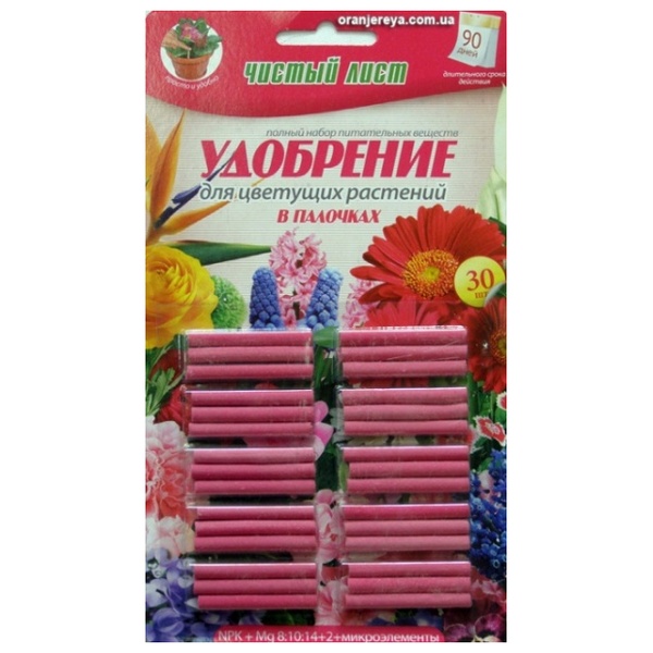 Комплексне добриво Квітофор Чистий лист у паличках містить необхідні для повноцінного росту рослини макро- та мікроелементи, а також комплекс вітамінів, який збільшує стійкість до хвороб та несприятливих умов утримання.