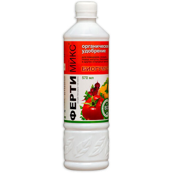 ФЕРТИмікс біогумус для всіх видів городніх культур (помідорів, огірків, перцю, капусти, баклажанів та ін) - органічне добриво на основі біогумусу (продукту переробки червоного каліфорнійського черв'яка) Ефективність застосування: - стимулює коренеутворення та активне зростання, - гарантує високу Збільшує врожайність на 30-40%, - покращує смакові та харчові якості врожаю, - знижує захворюваність рослин. Склад: Гумус: до 15 г/л Макроелементи: азот-7г/л, фосфор-7г/л, калій-7г/л, Мікроелементи: В2, В6, В12, РР