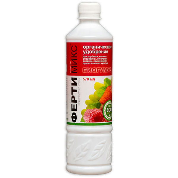 ФЕРТИмікс біогумус для всіх видів ягідних культур (полуниці, малини, смородини, винограду, ожини, агрусу) - органічне добриво на основі біогумусу (продукту переробки червоного каліфорнійського черв'яка) Збільшує врожайність на 30-40%, - покращує смакові та харчові якості врожаю, - знижує захворюваність рослин. Склад: Гумус: до 15 г/л. Макроелементи: азот -10г/л, фосфор -12г/л, калій -15г/л В2, В6, В12, РР