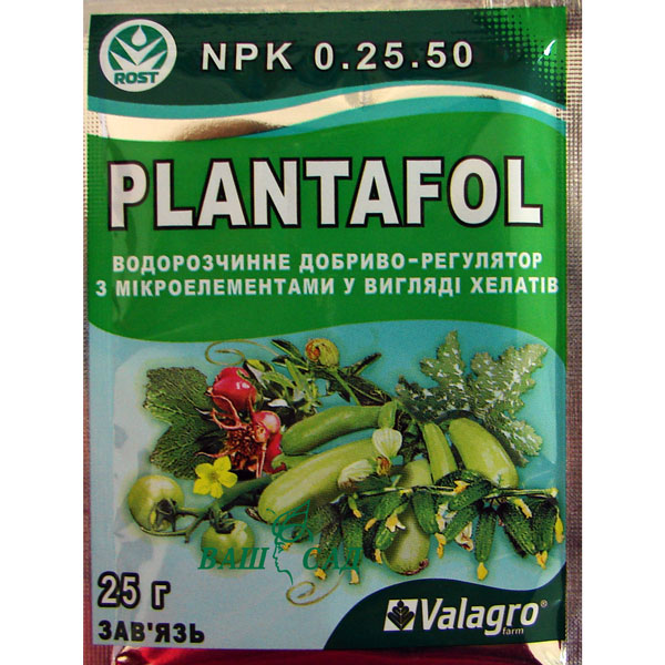 Плантафол 0-25-50 Зав'язь забезпечує активне формування зав'язі, зберігаючи у своїй рівномірний розвиток плода. Plantafol - ідеальне добриво для листового підживлення широкого спектру культур. Добриво має відмінну розчинність і вноситься через обприскувачі з будь-якими типами форсунок. Покращує вегетацію та плодоношення різних культур, підвищує якісні характеристики врожаю. Доповнює кореневе підживлення та сприяє розвитку рослин під час несприятливих погодних умов (заморожування, посуха, надлишок вологи та ін.). Спеціально підвищення ефективності до складу препарату входить прилипатель.