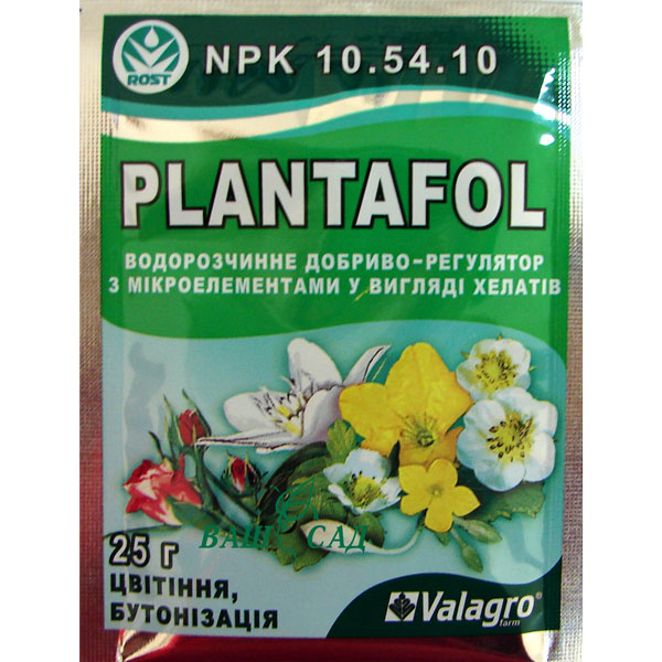 Плантафол 10-54-10 Цвітіння, бутонізація - водорозчинне добрива-регулятор з мікроелементами у вигляді хелатів, що забезпечує активне цвітіння рослин. Добриво покращує вегетацію та плодоношення різних культур, підвищує якісні характеристики врожаю, доповнює кореневе харчування, сприяє розвитку рослин за несприятливих умов (заморожування, посуха, надлишок вологи). Спеціально для ефективності до складу входить прилипач.