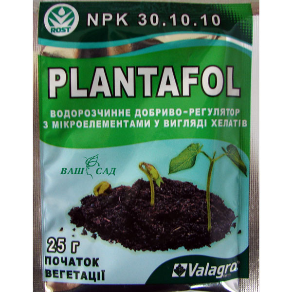 Плантафол 30-10-10 Початок вегетації - добриво для позакореневого підживлення з величезним переважанням азоту. Амідна форма азоту в цьому добриві найбільш оптимальна для некореневого підживлення. Ця формула застосовується для нарощування зеленої (вегетативної) маси. Добриво має відмінну розчинність. Для підвищення ефективності до складу препарату входить прилипач, що забезпечує максимальний ефект від листового підживлення. Збалансоване для кожної стадії розвитку співвідношення поживних речовин дозволяє оптимізувати зростання рослин, підвищити та покращити якість та лежкість плодів.