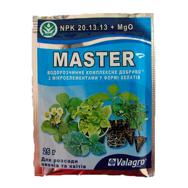 Добриво "Майстер" для розсади овочів та квітів - це універсальне, високоефективне, безхлорне, водорозчинне, комплексне добрива, призначене для кореневого підживлення розсади овочів та квітів. Збалансоване співвідношення мікро- та макроелементів задовольняє всі потреби рослин у поживних речовинах на початковому етапі вегетації, стимулює активне проростання насіння, підвищує рівень опірності хворобам, покращує приживаність розсади, знижує стресові прояви під час висадки та пересадки розсади. NPK. 20.13.13+MgO