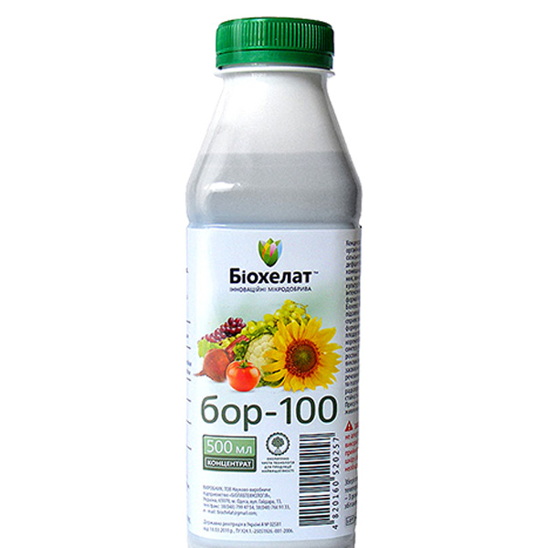 Добрива Біохелат Бор-100 - концентрат рідкого, високоефективного добрива, що легко засвоюється, в органічній формі. Застосовується для підживлення сільськогосподарських культур, чутливих до дефіциту бору (цукровий буряк, ріпак, люцерна, конюшина, цвітна капуста, плодово-ягідні, соняшник, виноград та ін.). Для більшості борофільних культур бор є критичним мікроелементом за інтенсивних технологій вирощування. Органічна форма бору добре засвоюється рослинами. Дія: Біохелат Бор-100 сприяє кращому проростанню пилку, усуває опадання зав'язей та посилює розвиток репродуктивних органів. Відіграє важливу роль у розподілі клітин та синтезі білків і є необхідним компонентом клітинної оболонки. Винятково важливу функцію виконує у вуглеводному обміні. Повністю розчинний у воді. Не містить шкідливих для рослин іонів натрію та хлору. Для кращого засвоєння елементів живлення препарат містить речовини, що сприяють їх швидкому перенесенню через восковий наліт епідермісу листа, а також радіопротектори – речовини, що підвищують стійкість комплексонатів до фоторуйнування. Присутність йоду посилює процес кисневого живлення тканин.