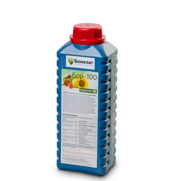 Добрива Біохелат Бор-100 - концентрат рідкого, високоефективного добрива, що легко засвоюється, в органічній формі. Застосовується для підживлення сільськогосподарських культур, чутливих до дефіциту бору (цукровий буряк, ріпак, люцерна, конюшина, цвітна капуста, плодово-ягідні, соняшник, виноград та ін.). Для більшості борофільних культур бор є критичним мікроелементом за інтенсивних технологій вирощування. Органічна форма бору добре засвоюється рослинами. Дія: Біохелат Бор-100 сприяє кращому проростанню пилку, усуває опадання зав'язей та посилює розвиток репродуктивних органів. Відіграє важливу роль у розподілі клітин та синтезі білків і є необхідним компонентом клітинної оболонки. Винятково важливу функцію виконує у вуглеводному обміні. Повністю розчинний у воді. Не містить шкідливих для рослин іонів натрію та хлору. Для кращого засвоєння елементів живлення препарат містить речовини, що сприяють їх швидкому перенесенню через восковий наліт епідермісу листа, а також радіопротектори – речовини, що підвищують стійкість комплексонатів до фоторуйнування. Присутність йоду посилює процес кисневого живлення тканин.
