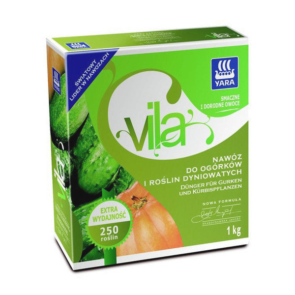 Добрива для огірків, цукіні, патисонів, динь та кавунів Yara Vila 1кг - гранульоване добриво для підживлення огірків та всіх сортів гарбузових культур: цукіні, дині, гарбузи, патчі. Для вирощування у ґрунті та мінітеплицях. Спеціально підібрана формула забезпечує багатий урожай та запобігає ефекту запліднення та надмірному накопиченню нітратів у рослинах. Регулярне використання добрив збільшує стійкість рослин до захворювань. Вирощування у ґрунті: застосовувати близько 50 г добрива на 1 м 2 посівів, після ретельного змішування та посадки рослин (посіву насіння), поливають щедро водою, не дозволяючи вимивати насіння. Додаткове внесення добрив здійснюється через 3-4 тижні. Розсипати добриво рівномірно вздовж посадок у кількості 20г на м 2 Вирощування посівів у теплицях: до посадки / посіву насіння, як і у разі обробітку ґрунту. Додаткове внесення добрив здійснюється через 2-3 тижні. Вносити добриво рівномірно вздовж посадок у кількості 30 г на м 2