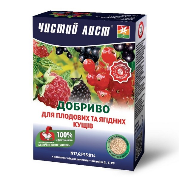 Чистий лист для плодових та ягідних – забезпечує рослину повноцінним харчуванням, компенсує дефіцит макро та мікроелементів, підвищує опірність хворобам, гнилам та переохолодженню.