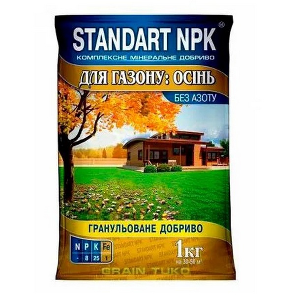 Гранульоване фосфорно-калійне добриво Стандарт НПК застосовується для підживлення всіх видів газонних трав в осінній період з метою зміцнення імунітету та успішної перезимівлі. Індивідуально підібраний комплекс мікроелементів, а саме фосфор (Р), калій (К) та залізо (Fe), повністю задовольняє потреби газону восени, перешкоджає його в'яненню та пожовтінню, підвищує імунітет та стійкість до рясних опадів. Збалансований склад макроелементів сприяє зміцненню кореневої системи та стійкості газонного покриву в зимовий період до перепадів температур та надмірної вологості. Серія добрив Grain Tuko є гранульованим комплексним добривом з індивідуально підібраним співвідношенням поживних речовин. Наявність заліза у складі добрива, захищає газон від хлорозу та сприяє швидкому відновленню здорового зеленого кольору. Відсутність азоту у складі добрива приглушує активне зростання і приводить рослини у стан спокою, сприяючи благополучній перезимівлі травостою.
