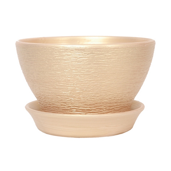 Стильний керамічний горщик для сенполій із перламутровою поверхнею. Фіалочниці з кераміки мають вагомі переваги: їх стінки пропускають повітря, необхідне кореневій системі рослин, коріння в цих вазонах не перегрівається.