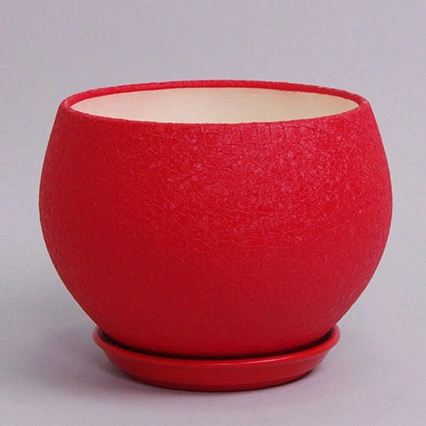 Керамічний горщик для квітів Куля шовку червоного кольору виготовляється за особливою технологією. Поверхня має рельєфну структуру, подібну до стиснутої шовкової тканини. Незважаючи на свій екзотичний зовнішній вигляд, це дуже практичний горщик для квітів. Горщик має дренажний отвір та укомплектований підставкою. Зроблений із високоякісної кераміки.