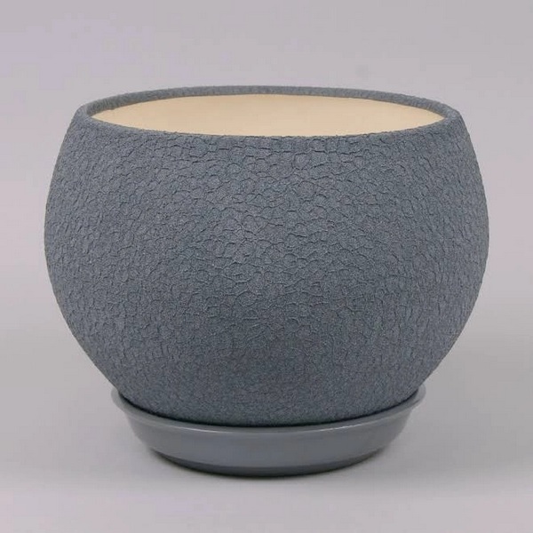 Керамічний горщик для квітів Куля шовку кольору металік виготовляється за особливою технологією. Поверхня має рельєфну структуру, подібну до стиснутої шовкової тканини. Незважаючи на свій екзотичний зовнішній вигляд, це дуже практичний горщик для квітів. Горщик має дренажний отвір та укомплектований підставкою. Зроблений із високоякісної кераміки
