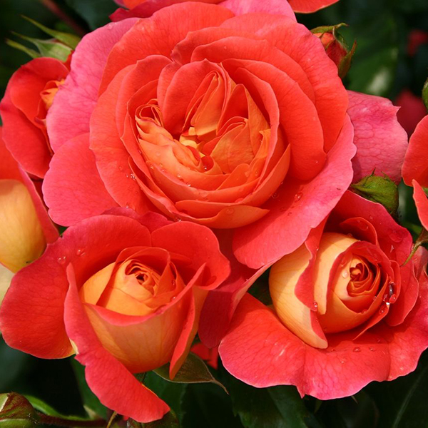 Яскрава, стійка флорибунда. Неповторна, сяюча квітка на початку розпуску червоно-оранжева з жовтим реверсом поступово стає малиновою. Кущ пишний, низький (до 70 см). Цвіте рясно, пензлями весь сезон. Стійко переносить спеку, холод та дощ. Листя темно-зелене, щільне, блискуче. Сорт морозостійкий.
