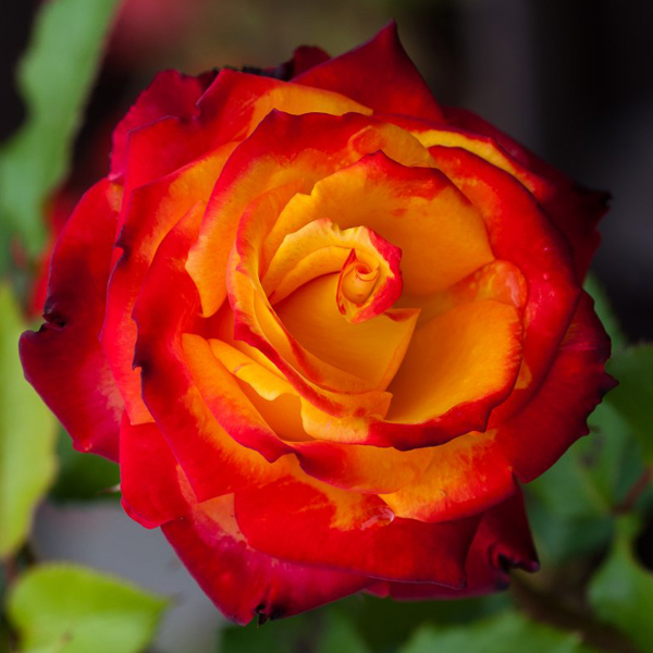Класичний бутон чайно-гібридної троянди в напіврозпуску, у повному розпуску - вільної чашоподібної форми. Квітка жовта з яскраво-червоною облямівкою по краю пелюсток, помірно-махрова, розцвітаючи, показує серединку. Листя темно-зелене, глянсове.