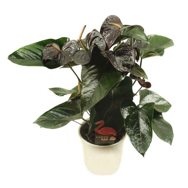 Антуріум Джамбо Блек - це ефектний сорт, що цінується за велике, овальне, глянсове листя глибоких відтінків від темно-зеленого до чорного, а також за великі, воскоподібні, майже чорні квіти, що надають рослині пишний і вишуканий вигляд.