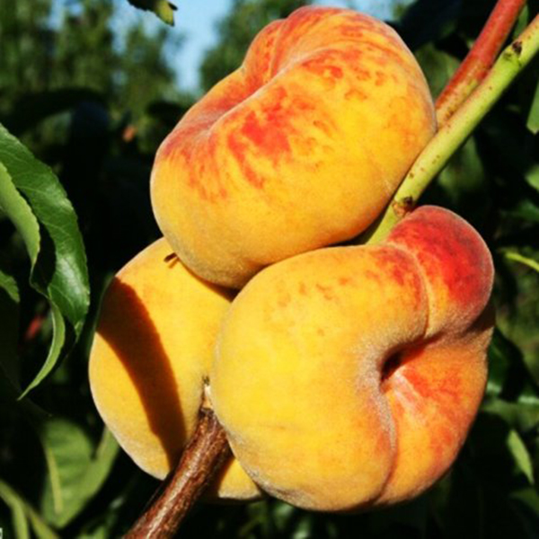 Плоди мають дископодібну форму з плоскою вдавленою вершиною та ямку, яка може досягати у розмірі до 5 см. Фрукт містить глибокий черевний шов. Щільна шкірка має невелику кількість пуху і від м'якоті не відокремлюється. Колір плодів може бути жовтим, помаранчевим, червоним із різними відтінками. Соковита м'якуш складається з волокон і пофарбована вона у світло-бежевий колір. У центрі плодів знаходиться невелика кісточка.