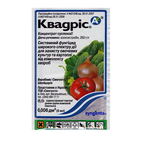 Фунгіцид Квадріс – системний препарат широкого спектру дії для захисту томатів, огірків, винограду, картоплі та ін. від комплексу хвороб. Сприяє підвищенню врожайності та покращує якість продукції, надає лікувально-профілактичну дію при боротьбі з різними захворюваннями переважної більшості сільськогосподарських культур. Препаративна форма: КЕ – концентрат емульсії. Діюча речовина: азаксистробін, 250 г/л. Хвороби, яких позбавляє препарат Квадріс: - фітоспороз, - мучниста роса, - плямистість, - макроспоріоз, - Альтернаріоз, - антрактозу, - пероноспороз, - гнилизна. Перелік оброблюваних культур: - картопля, - цибуля, - томати, - перець, - Баклажани.