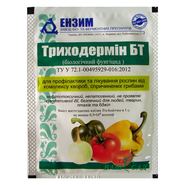 Триходермін БТ - це біологічний фунгіцид, який пригнічує розвиток фітопатогенів прямим паразитуванням, конкуренцією за субстрат, виділенням ферментів, антибіотиків (гліотоксин, віридин, триходермін та ін.) та інших біологічно активних речовин, які пригнічують розвиток багатьох видів збудників і гальмують їх. Переваги: - активно бере участь у розкладанні органічних сполук, - пригнічує патогени, що передаються через ґрунт та рослинні залишки, - ефективно пригнічує грибні хвороби та захищає від зараження: кореневими гнилями (пітіозні, різоктоніозні, фузаріозні), в'янення різної етіології, хвороб листків та стебел (аскохітоз та антракноз, альтернаріоз та сіра гнилизна).