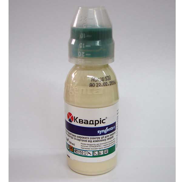 Фунгіцид Квадріс – системний препарат широкого спектру дії для захисту томатів, огірків, винограду, картоплі та ін. від комплексу хвороб. Сприяє підвищенню врожайності та покращує якість продукції, надає лікувально-профілактичну дію при боротьбі з різними захворюваннями переважної більшості сільськогосподарських культур. Препаративна форма: КЕ – концентрат емульсії. Діюча речовина: азаксистробін, 250 г/л. Хвороби, яких позбавляє препарат Квадріс: - фітоспороз, - мучниста роса, - плямистість, - макроспоріоз, - Альтернаріоз, - антрактозу, - пероноспороз, - гнилизна. Перелік оброблюваних культур: - картопля, - цибуля, - томати, - перець, - Баклажани.