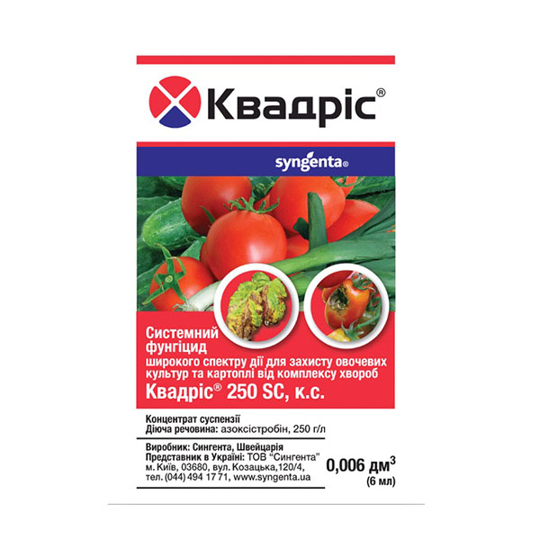 Фунгіцид Квадріс – системний препарат широкого спектру дії для захисту томатів, огірків, винограду, картоплі та ін. від комплексу хвороб. Сприяє підвищенню врожайності та покращує якість продукції, надає лікувально-профілактичну дію при боротьбі з різними захворюваннями переважної більшості сільськогосподарських культур.