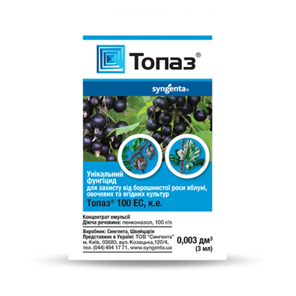 Топаз спеціальний високоселективний системний фунгіцид проти борошнистої роси, який має сильну лікувальну (3 доби) і профілактичну (7–8 діб) дію, що забезпечує надійний захист культур від борошнистої роси.