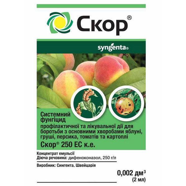 Скор - системний фунгіцид профілактичної та лікувальної дії для боротьби з паршою та борошнистою росою яблунь та груш, а також хвороб персика, томатів та картоплі. Норми витрати: для обробки яблунь та груш, а також персика від кучерявості листя – 1,6 мл препарату розчинити у 10 л води з розрахунку 2-5 л робочого розчину на одне дерево, для обробки посадок картоплі та томатів від альтернаріозу та фітофторозу - 5 мл препарату розчинити в 5 л води на 1 сотку. Максимальна кількість обробок для овочевих культур – дві, для плодових – три.