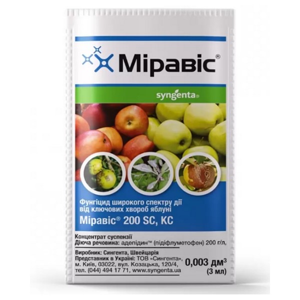 Контактно-системний фунгіцид Міравіс призначений для обробки яблуні, а також інших плодових та овочевих культур, з метою захисту від комплексу грибкових та патогенних захворювань.