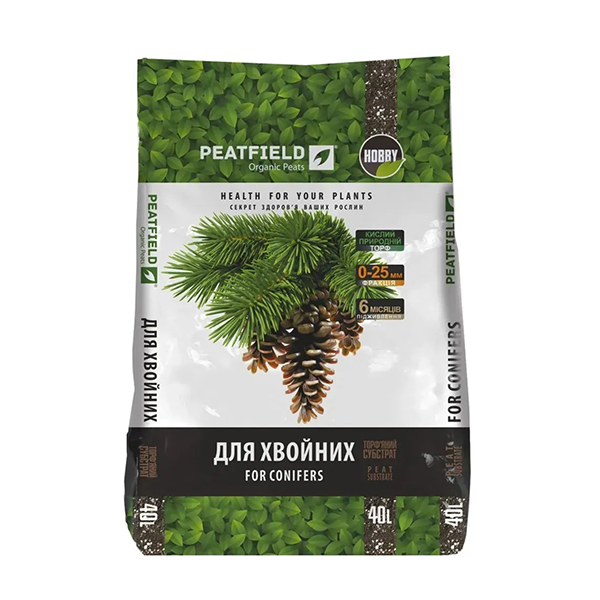 Торф'яний субстрат для хвойних PEATFIELD – повністю готовий до застосування. Ідеально підходить для професійного та аматорського вирощування декоративних хвойних рослин, таких як туя, сосна, ялина, ялівець, кипарис, тис, тощо.