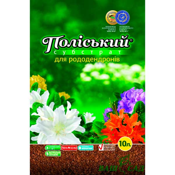 Субстрат "Поліський" - готова до використання відповідно скомпонована спеціальна суміш верхового та низинного торфу низького ступеня розкладання, перекомпостованої соснової кори та річкового піску. Спеціально підібрані складові суміші забезпечують: кисле середовище (рН 45 - 55), розвиток та укорінення кислолюбних рослин, рівновагу вологи у субстраті, необхідну мікрофлору, пишне та яскраве цвітіння. Призначений для вирощування рододендронів, азалій, вересових. Об'єм: 10л.