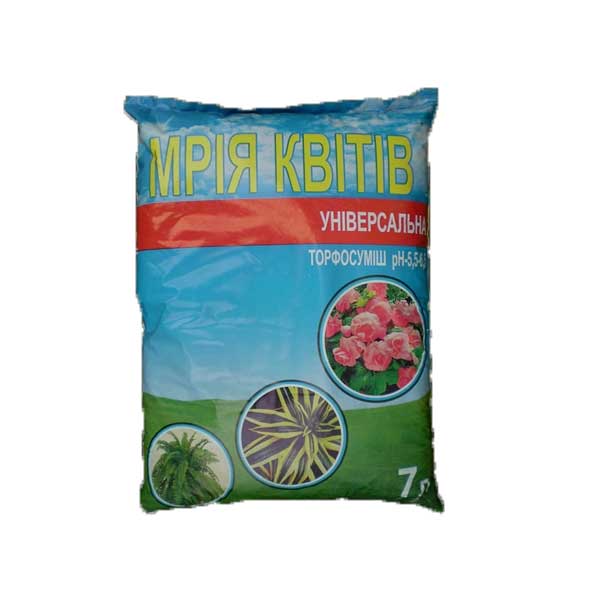 Універсальний торфосуміш Мрія квітів - це субстрат, що підходить для посадки будь-яких декоративних та городніх рослин. На відміну від натурального ґрунту, торф'яні суміші мають дуже тривалий термін розпаду, що гарантує їх більш високу ефективність. Призначення: Торфосуміш Універсальна від компанії Мрія квітів може використовуватися як для пікірування або посадки декоративних кімнатних рослин, квітів відкритого ґрунту, так і для висаджування саджанців вишні, груші та інших плодових дерев. Доведено користь торфу для листяних рослин, а також економічна вигода від використання в теплицях. Використання: Субстрат обов'язково має застосовуватися разом із хорошим дренажем, який укладається на дно ємності. Торф'яна суміш має середній розмір частинок, за рахунок чого одразу готова до використання. У насипу робиться лунка, яка ретельно зволожується, після чого висаджується рослина. Рекомендації до пікірування: Обов'язково перед початком робіт очистіть коріння рослини від непотрібних відростків, при необхідності обріжте їх. Коріння вирівнюється і опускається в заздалегідь підготовлену ямку в субстраті. Після цього лунка рясно поливається та присипається сухою сумішшю. Склад: Перліт, низинний, верховий торф, мінеральні частинки.
