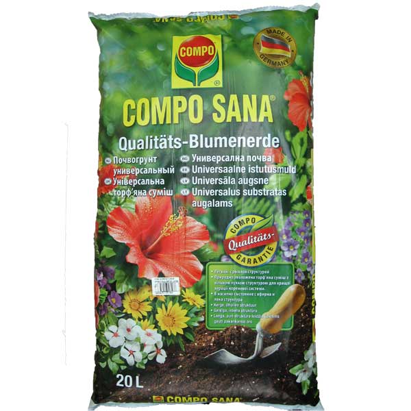 Сумішка Compo Sana універсальна - це легкий торф'яний субстрат, насичений стимуляторами росту коренів та корисними мікроелементами. Ґрунтосуміш має однорідну структуру, завдяки якій підходить як для садових рослин, так і для теплиць та кімнатних рослин. Містить вулканічну пил, що забезпечує коріння киснем, а також фірмову добавку Agrosil. Основа виробництва продукту видобувається з кар'єрів північ від Німеччини. Призначення: Грунтосуміш Compo Sana застосовується для висадки рослин, добрива ґрунту та посадки газонів. Використання: Compo Sana універсальна поставляється виробником вже готової до використання. Перед насипом рекомендується зробити дренаж, укладається субстрат за рівнем горщика або лунки. При посадці рослин і саджанців грунт суміш обов'язково зволожується і розпушується. Рекомендації до пікірування: У горщику з насипом потрібно зробити лунку, що відповідає корінням рослини. За потреби кореневища підрізаються. У підготовлений отвір вставляють у розправленому вигляді, після чого акуратно присипають торф'яною сумішшю. Кислотність pH: 5.0-6.5 Склад: Розчинний азот, калій, фосфор, добавка для росту та зміцнення кореневої системи (Agrosil), Perlit.