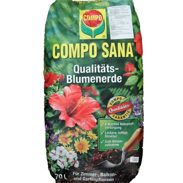 Сумішка Compo Sana універсальна - це легкий торф'яний субстрат, насичений стимуляторами росту коренів та корисними мікроелементами. Ґрунтосуміш має однорідну структуру, завдяки якій підходить як для садових рослин, так і для теплиць та кімнатних рослин. Містить вулканічну пил, що забезпечує коріння киснем, а також фірмову добавку Agrosil. Основа виробництва продукту видобувається з кар'єрів північ від Німеччини. Призначення: Грунтосуміш Compo Sana застосовується для висадки рослин, добрива ґрунту та посадки газонів. Використання: Compo Sana універсальна поставляється виробником вже готової до використання. Перед насипом рекомендується зробити дренаж, укладається субстрат за рівнем горщика або лунки. При посадці рослин і саджанців грунт суміш обов'язково зволожується і розпушується. Рекомендації до пікірування: У горщику з насипом потрібно зробити лунку, що відповідає корінням рослини. За потреби кореневища підрізаються. У підготовлений отвір вставляють у розправленому вигляді, після чого акуратно присипають торф'яною сумішшю. Кислотність pH: 5.0-6.5 Склад: Розчинний азот, калій, фосфор, добавка для росту та зміцнення кореневої системи (Agrosil), Perlit.