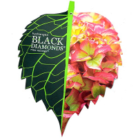 НОВИНКА 2015 У 2015 р. у продаж надійшла нова серія темнолистих гортензій BLACK DIAMONDS®. Ця серія відрізняється компактністю і густотою куща, темним, майже чорним, фіолетово-зеленим листям з контрастними світлими прожилками та яскравими сферичними або зонтичними квітами. Кущ висотою до 1 м, в контейнерах має висоту 0.4 - 0.6м. Торішні пагони здерев'яніли, поточного року - трав'янисті, деревні лише наступного року. Це призводить до слабкої холодостійкості крупнолистих гортензій (до -23). Як і інші, крупнолистние гортензії цвітуть кінцях однорічних пагонів. Але на відміну від інших видів гортензій, квітками можуть закінчуватися не всі однорічні пагони, а переважно виросли з кількох верхніх бруньок пагонів попереднього року. Тому зазвичай кажуть, що великолистна гортензія цвіте на торішніх пагонах. Потребує укриття на зиму.