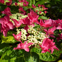 Гортензія крупнолистова Rotschwanz - зонтична гортензія з рідкісною плоскою формою кольорів. Маленькі центральні квіточки жовтувато-рожевого кольору. Маргінальні квіти темно-червоні, зіркоподібної форми. Забарвлення кольорів залежить від кислотності ґрунту. У лужному або нейтральному грунті квіти будуть рожеві, але чим вища кислотність, тим червонішим буде колір пелюсток. Цвіте з липня до серпня. Висота в саду 80-120 см ширина 100 см. Добре підходить для контейнера та невеликих садів. Міцна та витривала рослина. Місцерозташування та ґрунт: краще ростуть у півтіні. Повне полуденне сонце неприпустимо, але дуже глибока тінь так само не бажана. Оптимальним буде кілька годин прямого ранкового чи вечірнього сонця. Ґрунти бажано родючі, вологі та прохолодні, які не надто сильно висихають протягом літа. Полив глибокий та регулярний, без тривалого підсушування. Підживлення комплексними мінеральними добривами дозволять гортензії проявитися у всій своїй красі. Зимове та літнє мульчування так само піде на користь. Восени можна видалити непривабливі частини рослини, щоб кущ виглядав доглянутим. На початку весни обріжте всі слабкі, внутрішні та мертві гілки, а також підріжте кінчики решти гілок. Ця операція збільшить кількість пагонів та квітів. Але якщо обрізати занадто коротко, то цвітіння цього сезону ослабне. Обрізайте лише кінчики. Обрізати намагайтеся на зовнішню бруньку, цей принцип дозволяє сформувати правильну форму куща.