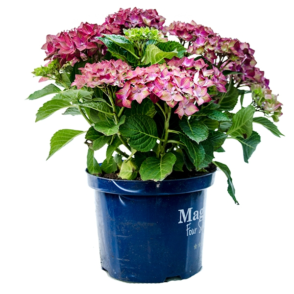 Саджанці гортензії Magical чудово цвітуть у контейнерах, на патіо та в садах. Суцвіття гортензій Magical Four Seasons стійкі до сонця, дощу та вітру, завдяки дуже міцним квітконосам та пелюсткам. У вазі суцвіття гортензії сортогрупи Magical Four Seasons зберігають свою свіжість набагато довше, ніж інші сорти гортензій. Крім характерної риси всіх гортензій Magical - зміна кольору пелюсток протягом усього цвітіння. Гортензія Magical може порадувати різьбленими краями, оригінальною "жатою" фактурою пелюсток, та аметистовою бусинкою в центрі. Квітки ніжно-рожеві, поступово змінюють своє забарвлення на бузково-рожевий із салатовими мазками, а в кінці цвітіння повністю зелені. Кущ компактний, висотою до 1,2 м, шириною до 1 м. Садова гортензія Magical цвіте на гілках першого року, це означає, що навіть якщо вся надземна частина гортензії цих унікальних сортів вимерзне, то на нових пагонах, що піднялися весною в липні - серпні. вже будуть цвісти дивовижні за красою суцвіття. Рекомендації щодо посадки: Гортензія висаджується в сонячних місцях ділянках. Глибина посадкової лунки 30 сантиметрів, діаметр витримується такою самою. Найкраще чагарник почувається на родючому ґрунті середньої кислотності. Під час посадки важливо обладнати яму гарною дренажною системою. Догляд: За гортензією не потрібно особливо ретельно доглядати. Мінеральні добрива вносяться щомісяця. Зверніть увагу, що їхня кількість має бути помірною, тому що гілки чагарник досить тонкі і якщо сформуються занадто великі квіти, то вони просто зламають пагони своєю вагою. Полив у міру висихання земляної грудки. Обрізка проводиться пізньої осені.