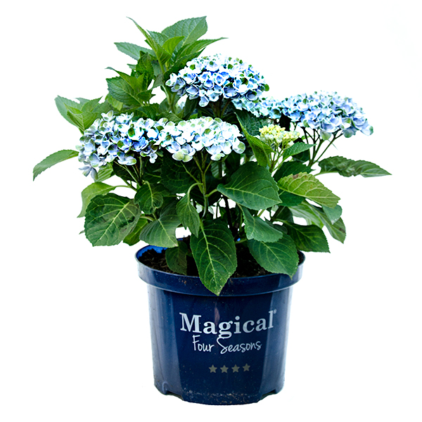 Саджанці гортензії Magical Four Seasons чудово цвітуть у контейнерах, на патіо та в садах. Суцвіття гортензій Magical Four Seasons стійкі до сонця, дощу та вітру, завдяки дуже міцним квітконосам та пелюсткам. У вазі суцвіття гортензії сортогрупи Magical Four Seasons зберігають свою свіжість набагато довше, ніж інші сорти гортензій. Крім характерної риси всіх гортензій Magical - зміна кольору пелюсток протягом усього цвітіння. Гортензія Magical може порадувати різьбленими краями, оригінальною "жатою" фактурою пелюсток, та аметистовою бусинкою в центрі. Квітки ніжно-рожеві, поступово змінюють своє забарвлення на бузково-рожевий із салатовими мазками, а в кінці цвітіння повністю зелені. Кущ компактний, висотою до 1,2 м, шириною до 1 м. Садова гортензія Magical цвіте на гілках першого року, це означає, що навіть якщо вся надземна частина гортензії цих унікальних сортів вимерзне, то на нових пагонах, що піднялися весною в липні - серпні. вже будуть цвісти дивовижні за красою суцвіття. Рекомендації щодо посадки: Гортензія висаджується в сонячних місцях ділянках. Глибина посадкової лунки 30 сантиметрів, діаметр витримується такою самою. Найкраще чагарник почувається на родючому ґрунті середньої кислотності. Під час посадки важливо обладнати яму гарною дренажною системою. Догляд: За гортензією не потрібно особливо ретельно доглядати. Мінеральні добрива вносяться щомісяця. Зверніть увагу, що їхня кількість має бути помірною, тому що гілки чагарник досить тонкі і якщо сформуються занадто великі квіти, то вони просто зламають пагони своєю вагою. Полив у міру висихання земляної грудки. Обрізка проводиться пізньої осені.