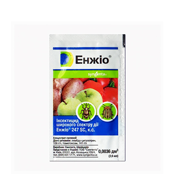 Енжіо 247 SC к.с. - новий системно-контактний, надзвичайно потужний інсектицид для захисту плодових, овочевих культур та картоплі від шкідників, що складається з двох діючих речовин. Препарат характеризується широким спектром на багатьох шкідників, і навіть на дорослі стадії розвитку кліщів. На відміну від інших інсектицидів ефективно діє при підвищених та знижених температурах та посушливих умовах навколишнього середовища. Термін захисту рослин від шкідників при обробці препаратом Енжіо 247 SC к.с. становить понад 20 днів. Контактна речовина, що входить до складу препарату, проникає через оболонку шкідників і призводить до їх знищення, системна речовина надходить у рослину, де накопичується в точках росту і забезпечує тривалий захист всієї рослини, а також її нових пагонів. Завдяки високій розчинності препарату, при попаданні в ґрунт, він всмоктується кореневою системою рослини і тим самим забезпечує додатковий ефект – захист від ґрунтових шкідників.