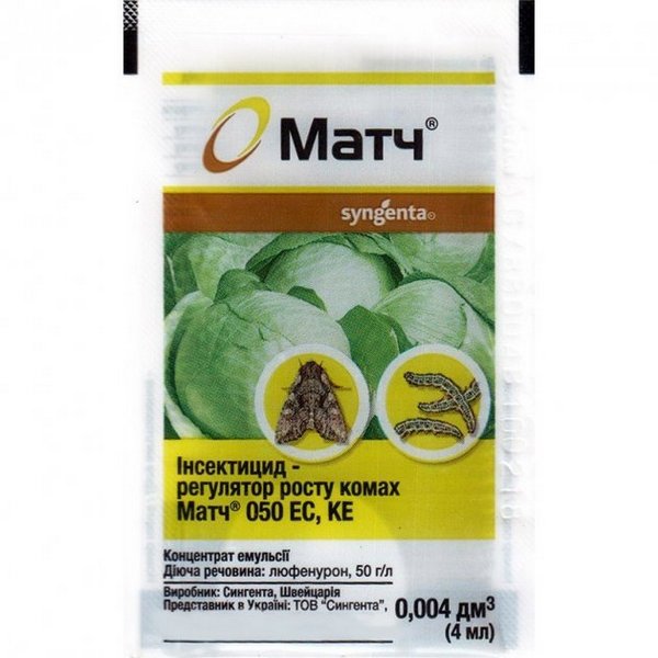 Матч – інсектицид для знищення комах-шкідників на овочевих, плодових культурах та виноградниках. Діюча речовина: люфенурон - 50 г/л Препарат має високу ефективність проти бурого плодового кліща та побічну дію проти інших видів кліщів у саду, а також кліща-свербіння на винограді. Термін застосування – початок відродження гусениць із яєць. Матч гарантовано захищає рослину протягом 30 днів. Матч знищує майже всі шкідливі організми на ділянках, при цьому не впливає на корисних членистоногих. Пакет 4 мл розвести в 5 л води для обприскування 1 сотки овочів. Для обприскування яблуні та винограду треба 2 пакети по 4 мл кожен розвести в 10 л води (на 1 сотку саду чи винограду). Максимальна кількість обробок – 2. Термін очікування після обробки: капуста, томати – 14 днів, яблуня, виноград – 30 днів.