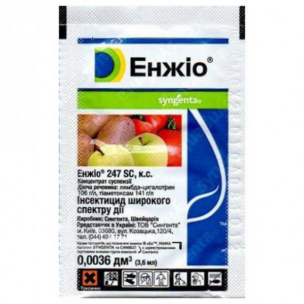 Енжіо 247 SC к.с. - новий системно-контактний, надзвичайно потужний інсектицид для захисту плодових, овочевих культур та картоплі від шкідників, що складається з двох діючих речовин. Препарат характеризується широким спектром на багатьох шкідників, і навіть на дорослі стадії розвитку кліщів. На відміну від інших інсектицидів ефективно діє при підвищених та знижених температурах та посушливих умовах навколишнього середовища. Термін захисту рослин від шкідників при обробці препаратом Енжіо 247 SC к.с. становить понад 20 днів. Контактна речовина, що входить до складу препарату, проникає через оболонку шкідників і призводить до їх знищення, системна речовина надходить у рослину, де накопичується в точках росту і забезпечує тривалий захист всієї рослини, а також її нових пагонів. Завдяки високій розчинності препарату, при попаданні в ґрунт, він всмоктується кореневою системою рослини і тим самим забезпечує додатковий ефект – захист від ґрунтових шкідників.