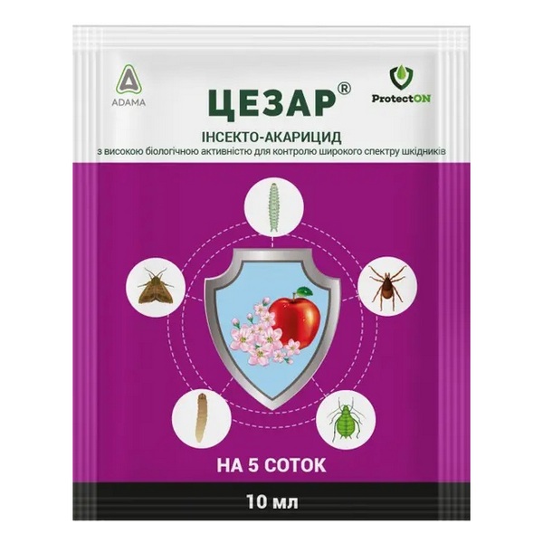 Цезар к.е. 10 мл (ProtectON) – це інсекто-акарицид з високою біологічною активністю для боротьби з широким спектром шкідників рослин, у тому числі проти всіх рухомих стадій кліщів. Інсектицид Цезар надає контактно-шлункову дію та паралізує нервову систему шкідників, що протягом декількох хвилин призводить до дезорієнтації, припинення харчування, паралічу та смерті комах («нокдаун-ефект»).