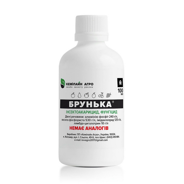 Брунька – це інсектоакарицид та фунгіцид для боротьби із зимуючими стадіями шкідників та хворобами плодових дерев та виноградників. Діючі речовини препарату (фосфориста кислота, фосфіт алюмінію, імідаклоприд, лямбда-цигалотрін) швидко проникають усередину рослин і розподіляються у всі частини. Завдяки цьому відбувається повне знищення комах навіть на необроблених поверхнях та під листом.