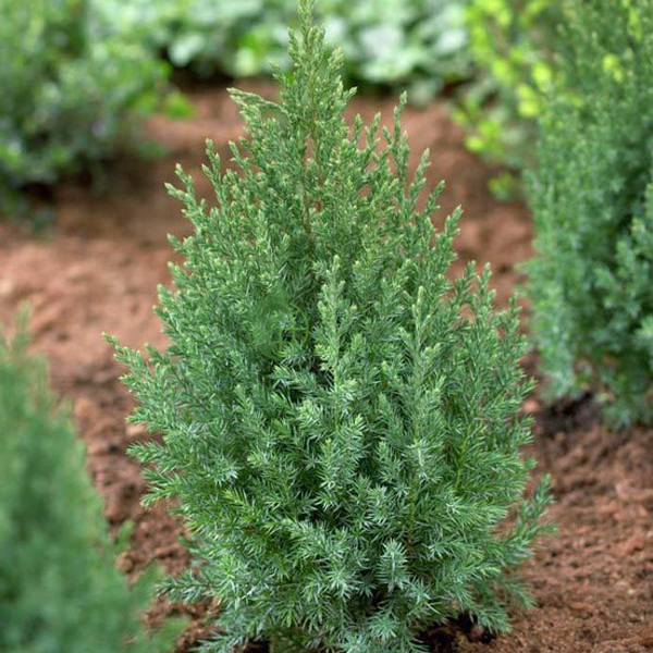 - чагарник з конусоподібною кроною і густими гілками, що вертикально ростуть. Росте повільно. Висота дорослої рослини 3,5 м, ширина – 1,5 м. Хвоя колюча синьо-зелена в зимовий час набуває сталевого відтінку. Плоди - фіолетово-коричневі шишкоягоди. Місцерозташування та грунт: Сонцелюбний, водночас переносить півтінь. Зимостійкий. Рослина до ґрунтів невибаглива, росте як на слабокислих, так і на слаболужних ґрунтах. Використання: Крім одиночних, групових посадок та вересових садів використовується для вирощування в контейнерах.