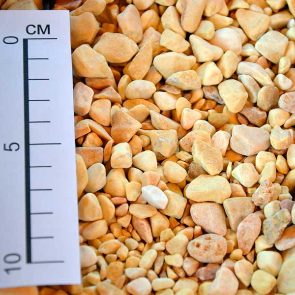 Область застосування: Декоративне облаштування садів, у т.ч. східних, доріжок та клумб, терас. Окантовка навколо будинків, дерев та кущів. Оздоблення басейнів, штучних ставків, фонтанів. Декорування вазонів з квітами. Прикраси могил. Колір жовтий. Розмір: 10-20 мм.